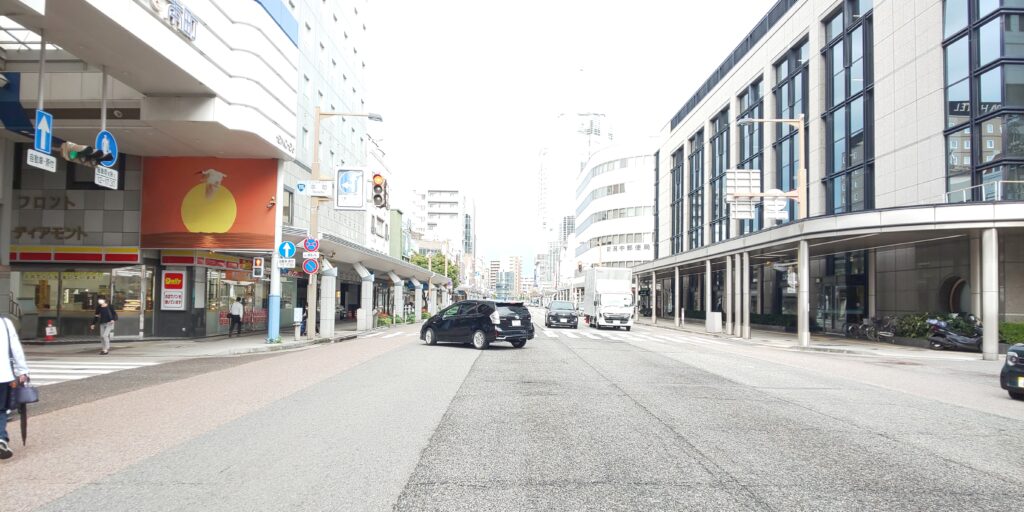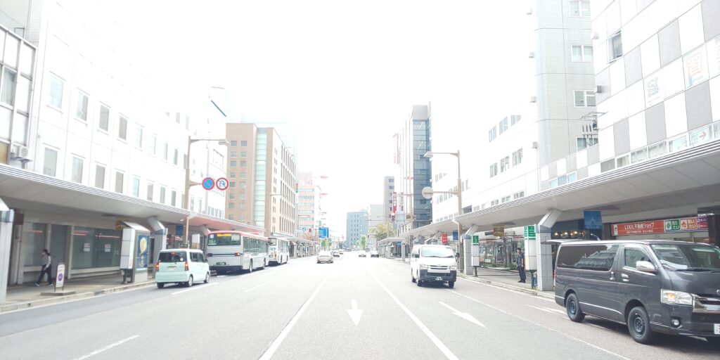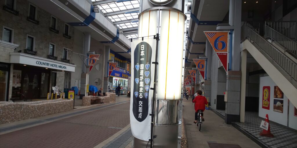 日本一国道が集まる交差点は、新潟駅からまっすぐに伸びる大通りにあります。