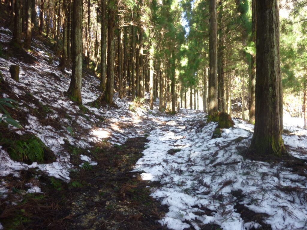 登山道は林道を利用するルートで、二子山との分岐となる途中の峠までは比較的歩きやすいのですが、そこから先の林道はそれなりに茂っていますので、雪が積もっている時に登る方が登りやすいと思います。