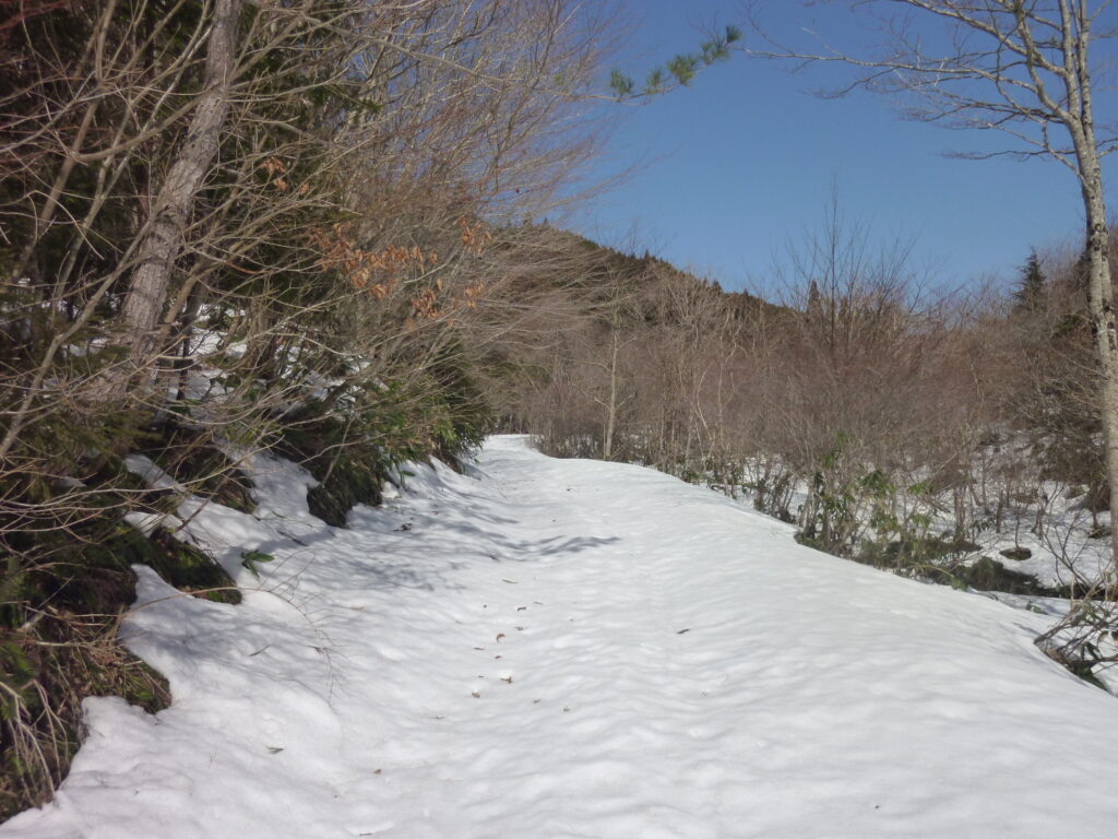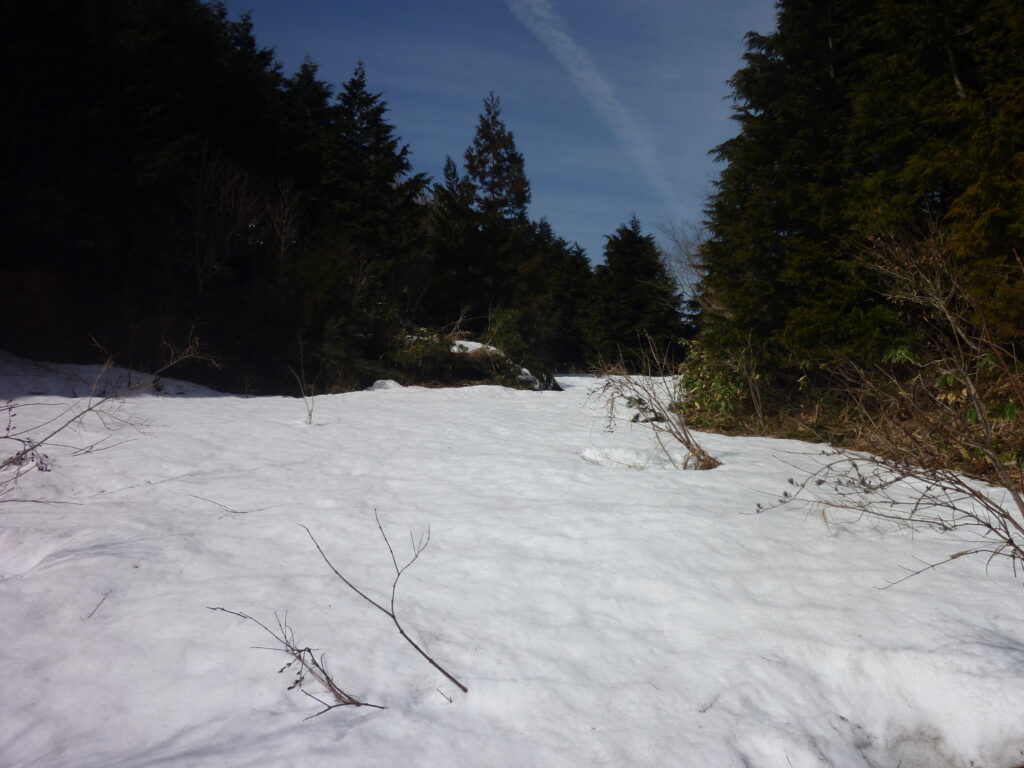 峠からの道は、所々で木が生えています。まあまあ行く手を遮ってるところもありました。そして、藪も見えるので、雪がないときついのかなと思います。