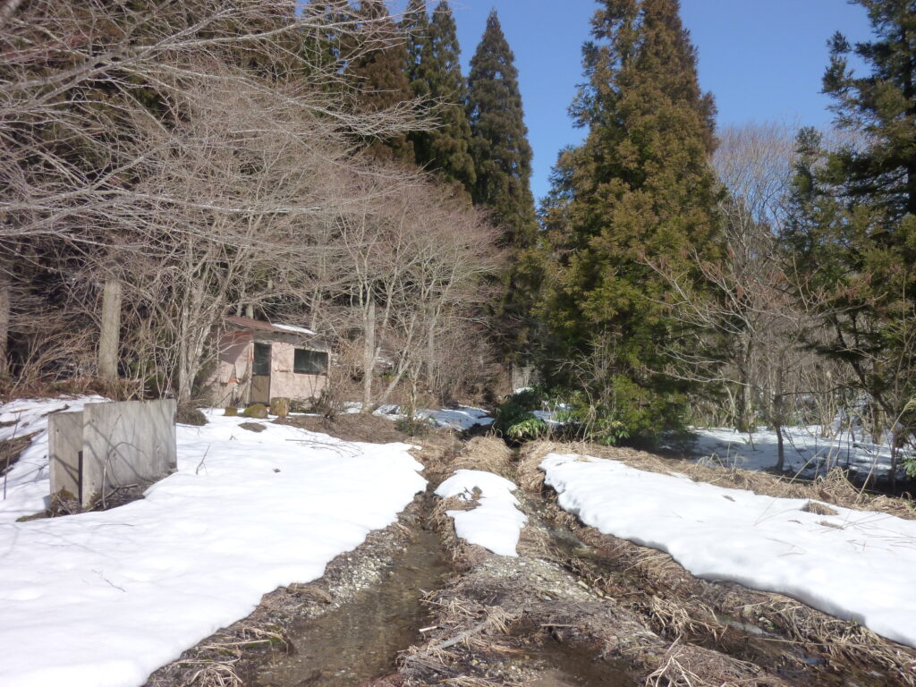 途中に旧作業小屋というのがあるのですが、その先で川が林道の上を通過しています。といっても、水量がないので、何の問題もありません。
